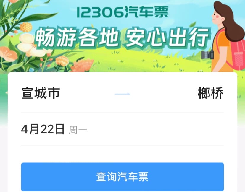 宣城到榔桥的大巴车:请在12306 APP的“汽车票”功能页面如下搜索,然后在线购票,并在宣城汽车站候车(宣城火车站边上)